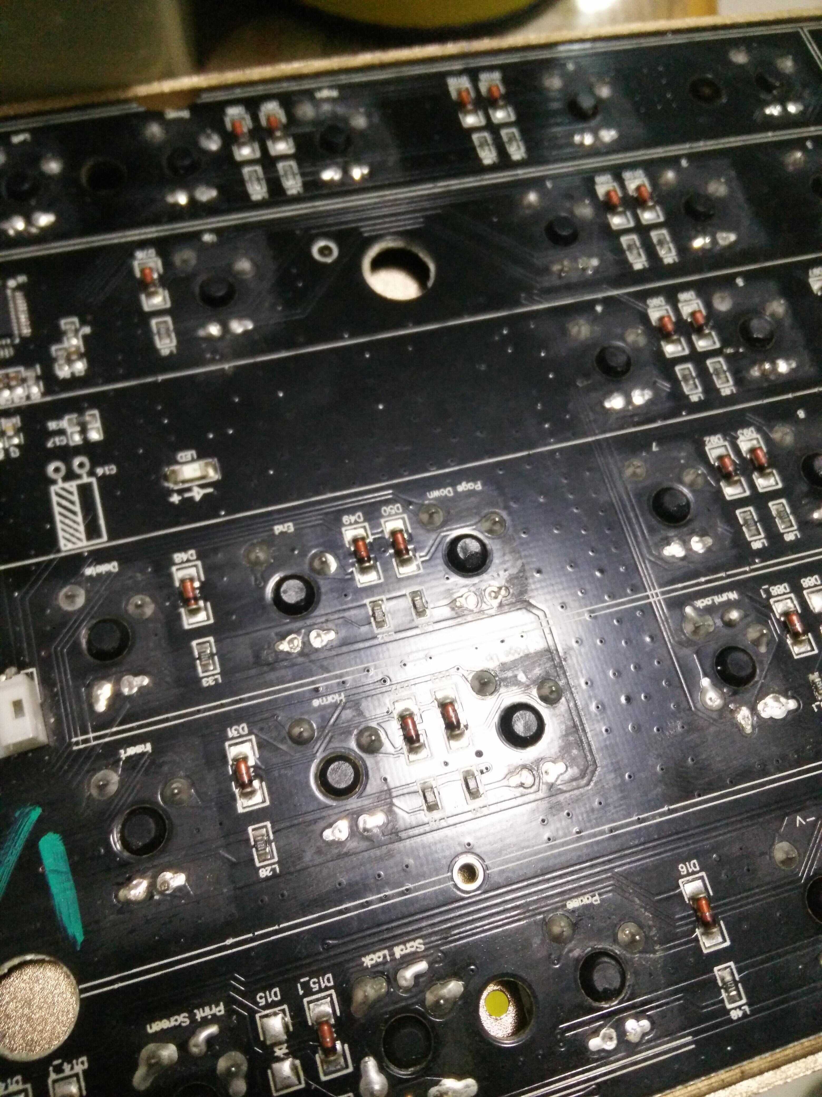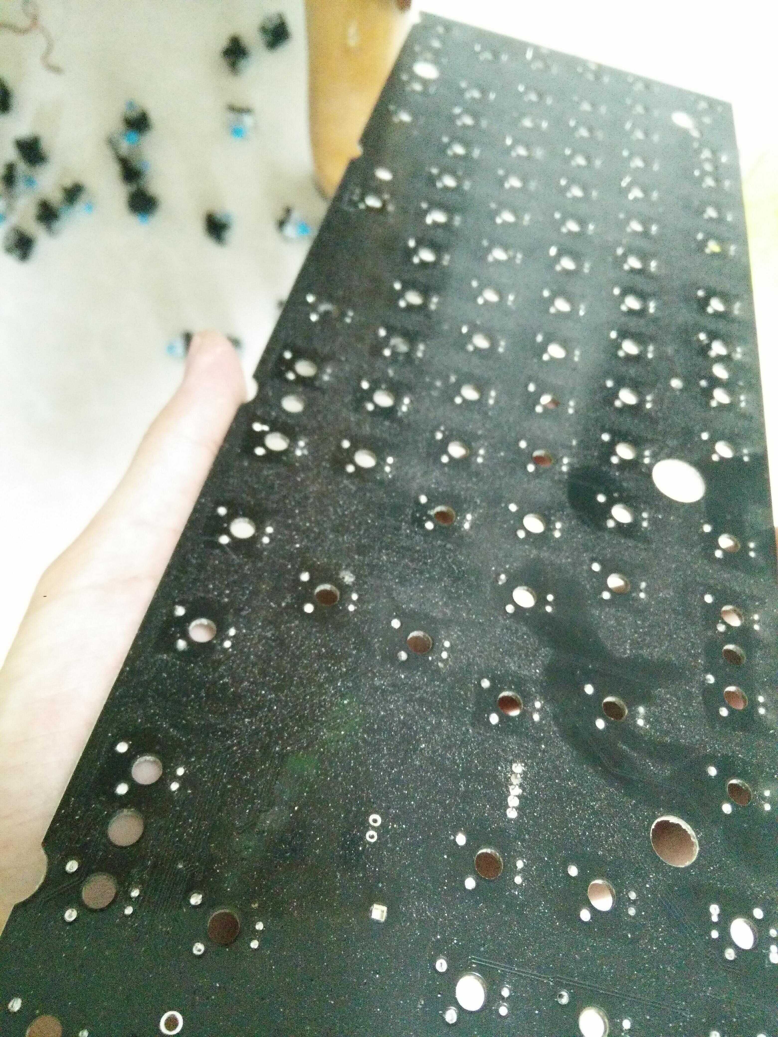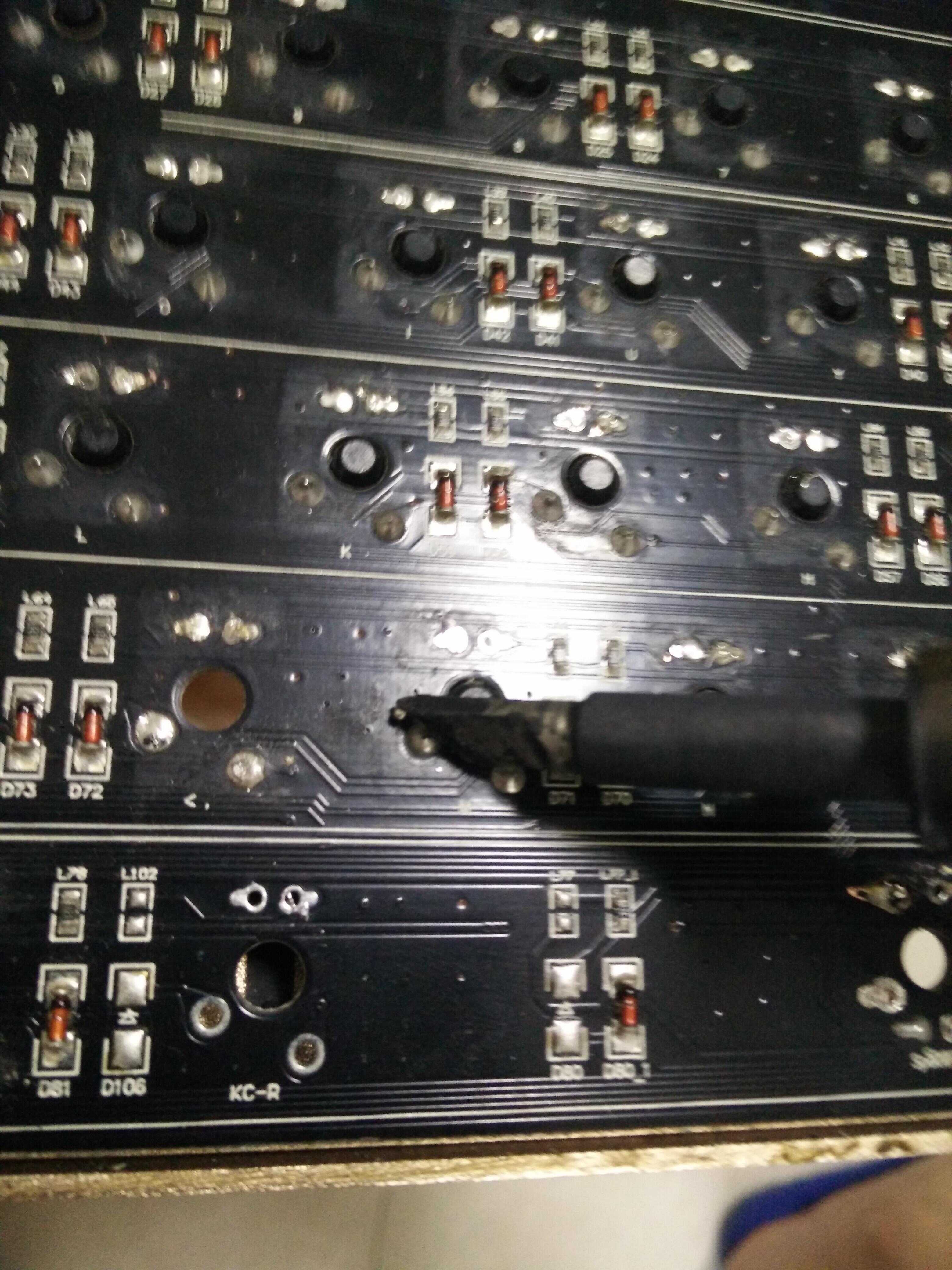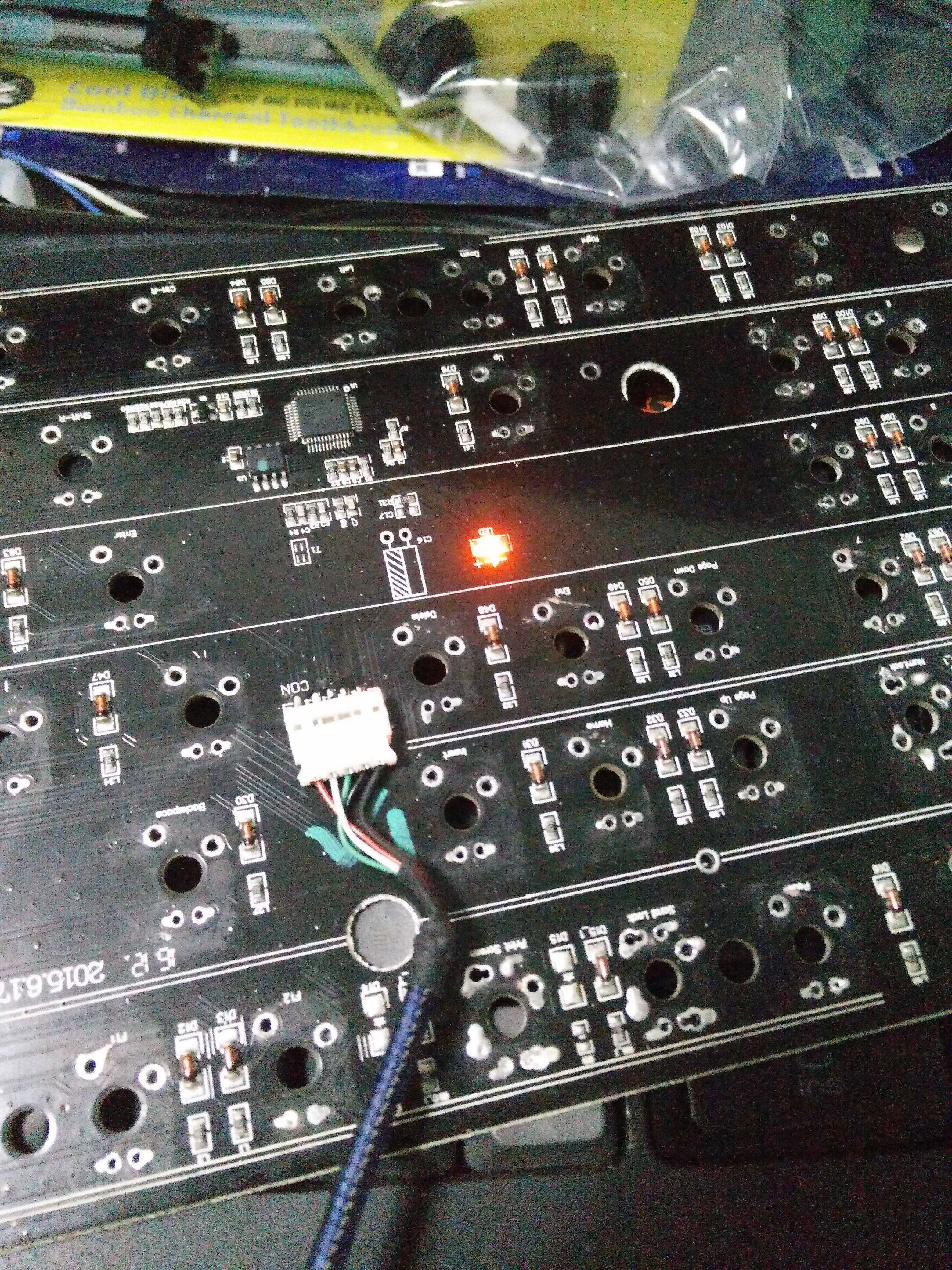 接下来是焊灯,这个好像没照片,几种颜色的灯全焊上去了,焊完发现有个灯不亮,蓝灯全部很暗,弄得我郁闷至极。。想想自己的键帽是不透光的,也就释怀了,那个不亮的灯大概是某个地方短路还是怎么滴,飞线无果,后面也就没管了。。