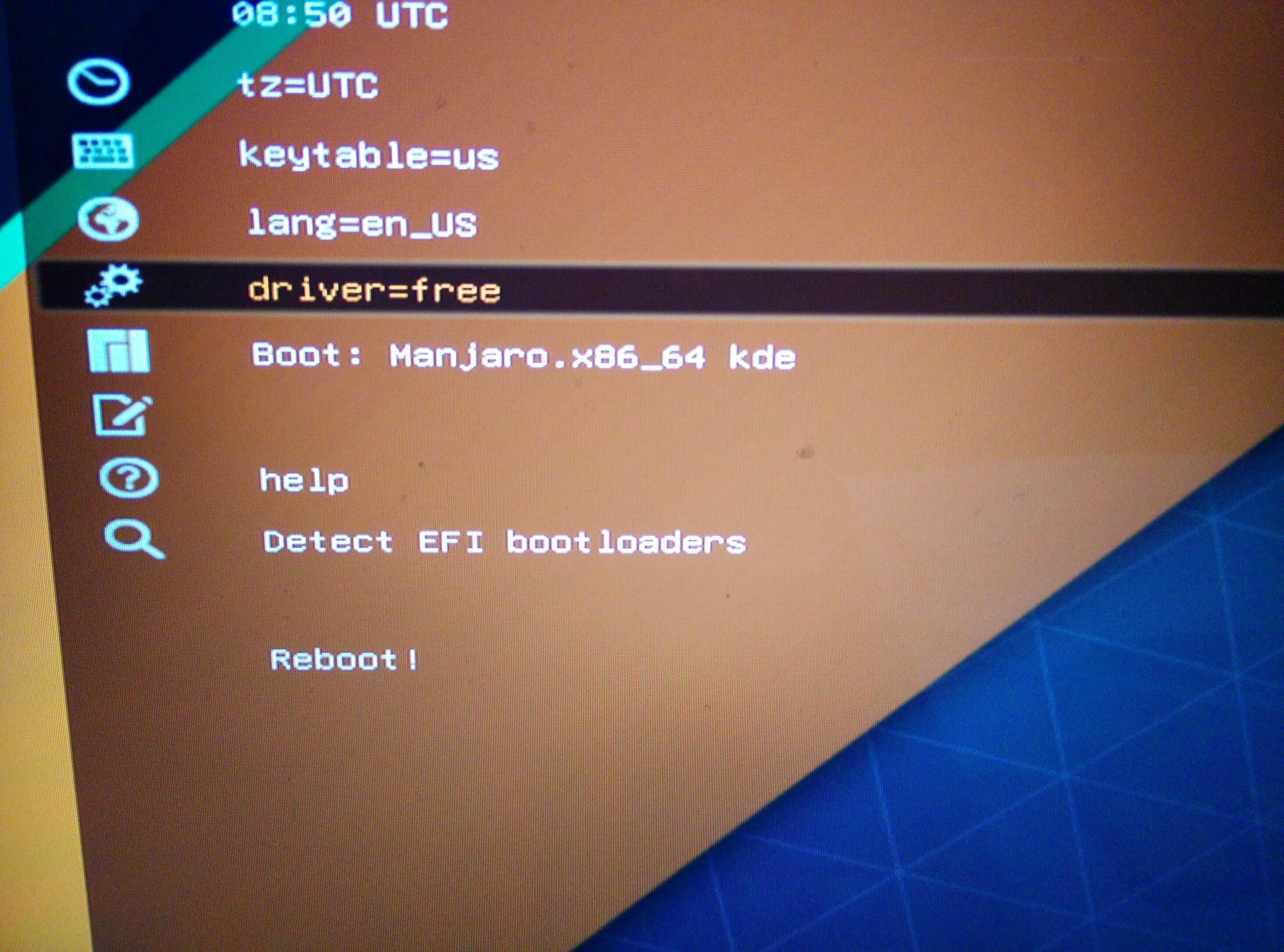 按下ctrl+x,返回刚才界面,选中Boot:Manjaro.x86_64 kde那行,按e,同理,drive=free 改成 drive=intel,按下ctrl+x,耐心等待启动成功即可